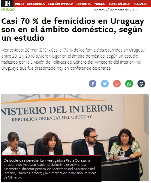 Casi 70 % de femicidios en Uruguay son en el ámbito doméstico, según un estudio