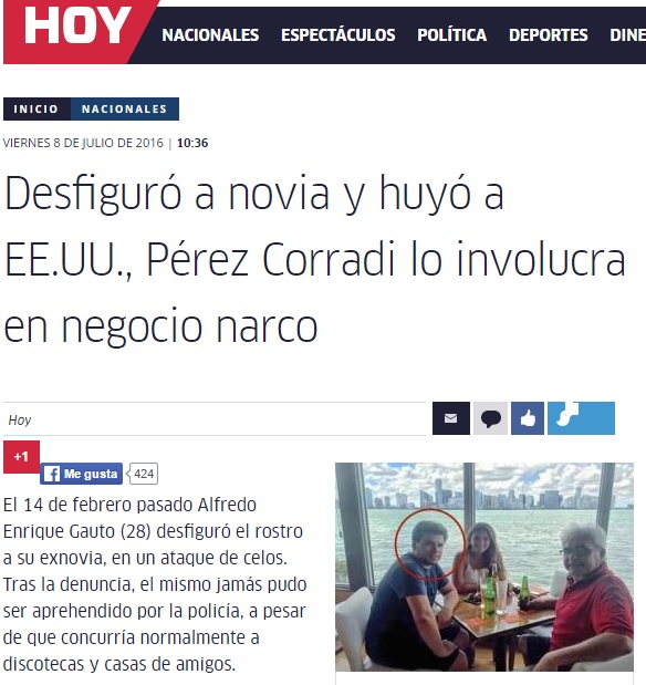 Desfiguró a novia y huyó a EE.UU., Pérez Corradi lo involucra en negocio narco